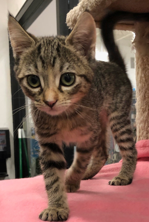 Gidget is an 8 week old, female tabby, Domestic Short Hair (brown, tan with black markings). She is tiny but mighty with a hearty appetite! |
