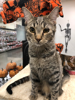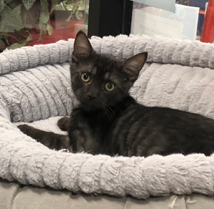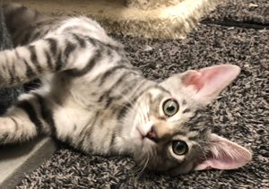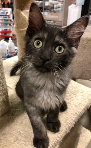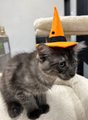 Cosmo - is a 12-week-old, male, smokey grey, DSH (Domestic Short Hair). He likes to be pet and loves to wrestle with his siblings. Our Halloween mascot!