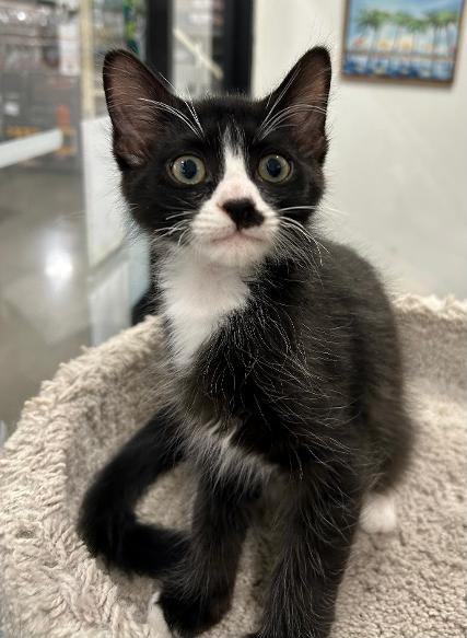 Opie - a 12-week-old, male tuxedo. Opie is a curious boy and very playful. Purrs when you hold him and a good eater!