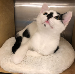 Barney is a 5-month old, male, black & white DSH. He is loving, friendly and bonded to Betty. He has also lived with other cats & a dog. Who can resist that black chin?!