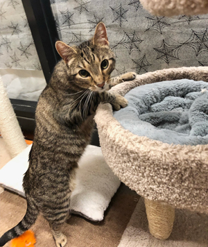 Kin is a 9-month-old, male, brown Tabby (DSH) with white boots. He is a sweet & loving kitten that was rescued from a shelter. He's very playful with other cats at the center.