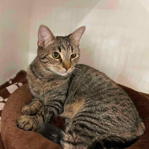 Carla - is a 3 1/2 month old, female brown tabby (DSH). Carla is friendly & playful and likes to wrestle with her brothers (Woody & Cliff).