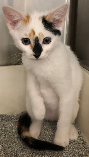 Cali is a 12 week-old, female, white with black & tan markings, domestic short hair (DSH). She is sweet and playful! She would love to be adopted with her brother (Ari) but not required.