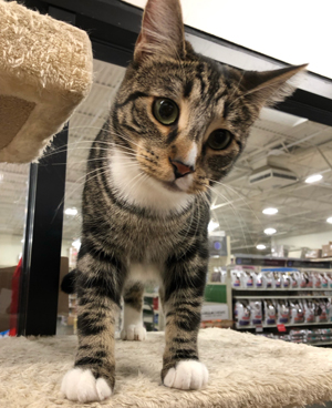 Kin is a 1 1/2 year old, male tabby. He was rescued from a shelter having been passed over due to a leg injury. His leg has healed and he awaits his forever home. Kin is sweet, friendly & very playful. Love his white "socks"!
