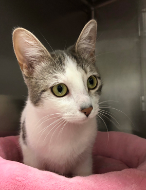 Biscuit is a 10-week-old, female, gray & white, DSH. She is sweet and a little more reserved than her sisters. She's the one with the PINK nose! 💕